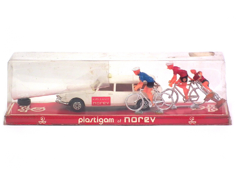contient : CITROEN ID 19 break 'AMBULANCE NOREV' & 3 coureurs cyclistes dont un décollé du socle - très légers manques de peinture par endroits sur les cyclistes - sous blister jamais ouvert - avec cale de boîte