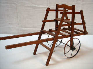longueur 65 cm - en bois avec roues métal - permet de promener 2 poupées dos à dos - fabrication style fin XIXème