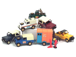 échelle 1/32ème - comprend : DEFENDER (2 exemplaires différents), AUTOWAY, POLICE, pick up militaire (manque un rétroviseur), PINE LODGE STABLES - on y joint 2 figurines dont une de marque indéterminée - petits manques