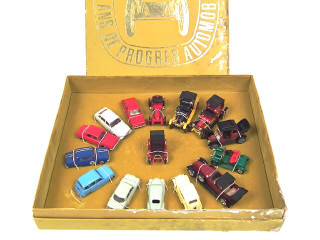 états de 'A-' à 'C' - dimensions : 45 x 35 cm - contient notamment : DAUPHINE, R4, R8, R10, R16, R6, 4CV, JUVAQUATRE, 40CV & 35HP - on y retrouve les marques : NOREV, SOLIDO, DINKY TOYS FRANCE, SAFIR, MATCHBOX & MINIALUXE - avec socle de présentation - le coffret est en état 'C' - quelques suspensions affaissées