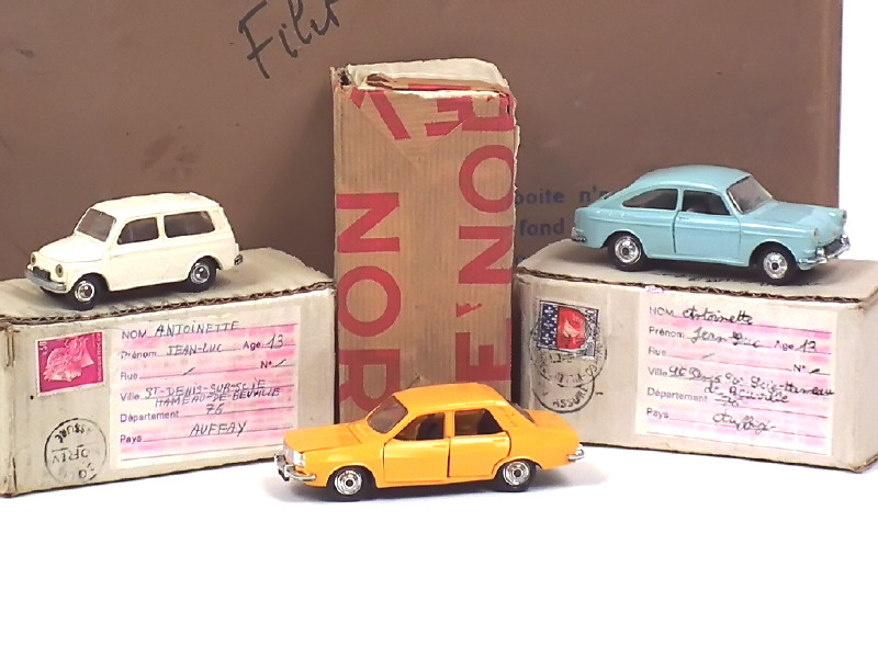 carrosserie très légèrement déformée - manque roue de secours - avec rare boîte d'envoi postal (datée du 11/12/68, tampon de la marque présent) comprenant une étiquette mentionant les coordonnées & l'âge du destinataire (état 'c' avec annotations sur un côté)