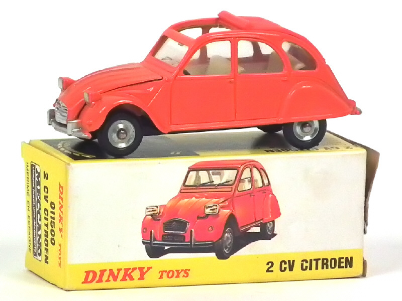DINKY TOYS (FRANCE) 500 CITROËN 2CV Décapotée (made in SPAIN) orange avec plancher vissé & plaque minéralogique arrière argent
