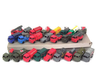 états de 'A' à 'C' - miniatures reproduisant les modèles : BERLIET (20 exemplaires différents), RENAULT & CITROEN (3 exemplaires dont 2 identiques) - véhicules motorisés (fonctionnent) sauf 2 incomplets - traces d'oxydation sur 11 planchers - coffret en état 'c' (couvercle déchiré)