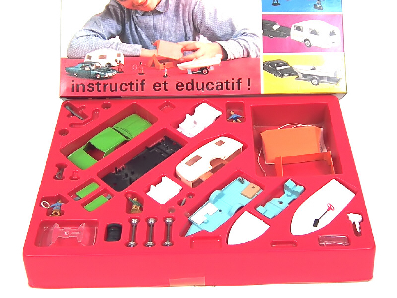 dimensions : 38,5 x 26,5 cm - contient : une FORD THUNDERBIRD, une caravane NOTIN, un canot à moteur, une remorque-plateau, une tente, 3 figurines & différents accessoires (dont certains manquants) - avec notice