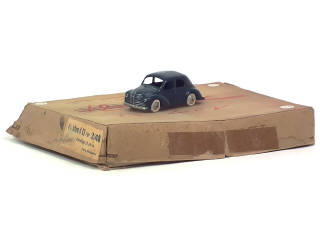 version avec calandre à 6 barres, socle pincé en alu & sans feu arrière - on y joint une rare boîte vide de 12 modèles (avec étiquette 'MINIATURES 4CV REF: 3/48 EMBALLAGE 12 PIECES, MADE IN FRANCE' collée sur un côté de couvercle) en état 'c' avec importantes annotations