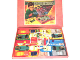 échelle 1/32ème - dimensions 51,5 x 35 cm - contient carrosseries de : STUDEBAKER LARK (2 exemplaires dont un coupé & un cabriolet), CITROEN DS 19, PORSCHE 356 A, 4 châssis avec moteurs à friction, 4 aménagements intérieurs, vitrages, pare-chocs, boîte de visseries & tournevis - quelques manques de pellicule chromées par endroits - ensemble maintenu d'origine sur carton de présentation illustré avec dénomination de chaque véhicule & sa référence - quelques petits accrocs sur la boîte - avec catalogue présentant les différents modèles de la gamme avec leurs caractéristiques techniques - SUPERBE ENSEMBLE DANS UN ETAT EXCEPTIONNEL !