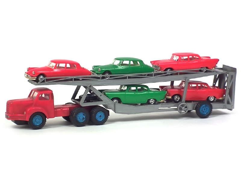 tracteur BERLIET (copie du modèle NOREV) avec moteur à friction (fonctionne) - avec CITROEN DS 19 (2 exemplaires différents, copies des modèles GEGE) & SIMCA CHAMBORD (3 exemplaires dont 2 identiques, copies des modèles NOREV) - support arrière de plaques minéralogiques non d'origine (parties cassées & recollées) - quelques manques de peinture plus ou moins importants sur les jantes du camion & de pellicules chromées sur les voitures (couleurs rares)