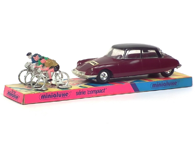 série 'COMPACT' - contient : CITROEN DS 19 'SERVICE DE PRESSE' (non conforme au coffret, jantes fêlées) & 3 coureurs cyclistes de couleurs différentes