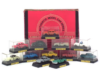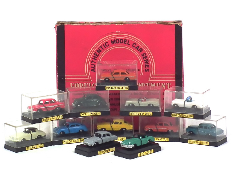 échelle HO - contient : MERCEDES-BENZ 300 SL, JAGUAR XK 150, CITROEN DS19, VOLKSWAGEN COCCINELLE, ALFA ROMEO 1300, MGA, AUSTIN A105, PORSCHE 356, OPEL CAPITAN, VOLVO AMAZON, FERRARI 375 & DAIMLER DK400 - avec boîtes-vitrines individuelles (en états 'b')