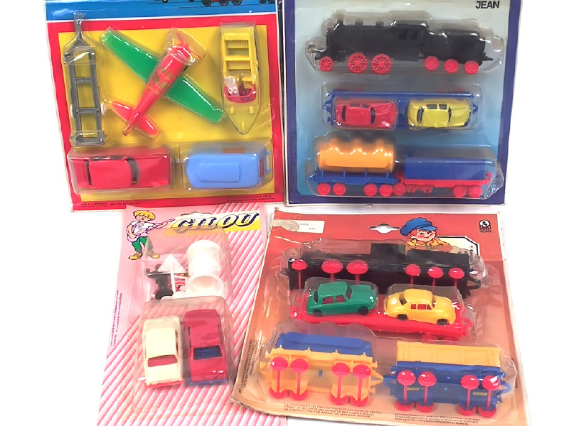 contient notamment : CITROEN DS 19 (dont une légèrement endommagée), locomotive à vapeur, avions & bateaux - on y joint un blister contenant CITROEN DS 21, ALFA ROMEO ALFETTA & accessoires de la marque GILOU - jamais ouverts