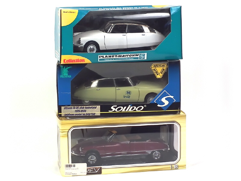 échelle 1/18ème - comprend : ID-DS CLUN NEDERLOAND 1979-1999 (série limitée numérotée 48/100 exemplaires) & PLANET-WATTOHN (boîte spécifique) - on y joint une DS 19 cabriolet de la marque NOREV (boîte en état 'c')