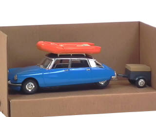 réalisation sur base SOLIDO - contient : CITROEN DS 19 1966 avec remorque & canot pneumatique sur galerie