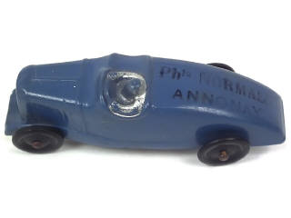 réalisation en celluloïd - longueur 9 cm - une fêlure sur l'avant du capot moteur (trace de colle) - modèle promotionnel avec inscriptions au tampon sur l'arrière de la carrosserie 'PHARMACIE NORMALE ANNONAY' - L'UN DES PLUS ANCIENS MODELES DE CE TYPE CONNU A CE JOUR !
