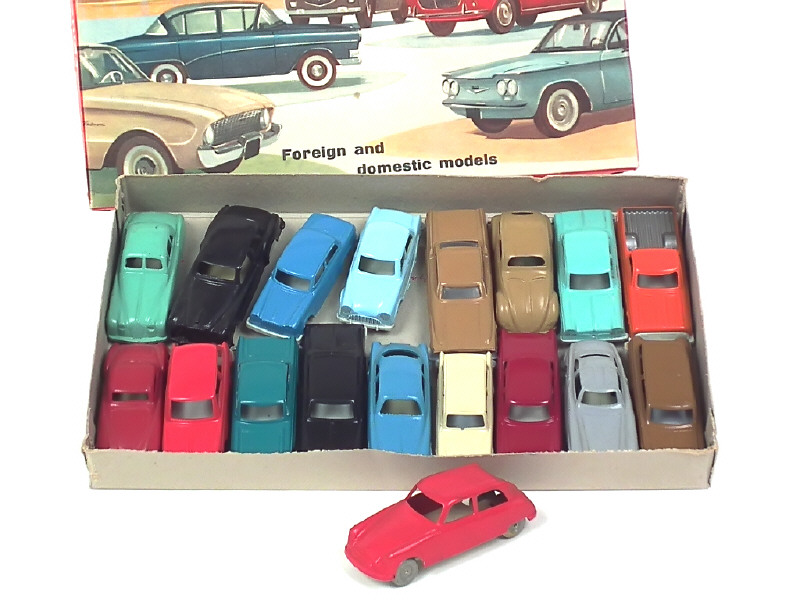 échelle approximative 1/75ème - miniatures reproduisant les modèles : JAGUAR, CITROEN, ROLLS ROYCE, DODGE, VOLKSWAGEN, CHEVROLET, FORD, MERCEDES, CADILLAC, SIMCA, ALFA ROMEO, CHRYSLER, MG & LANCIA - quelques petites annotations à l'intérieur du fond de boîte