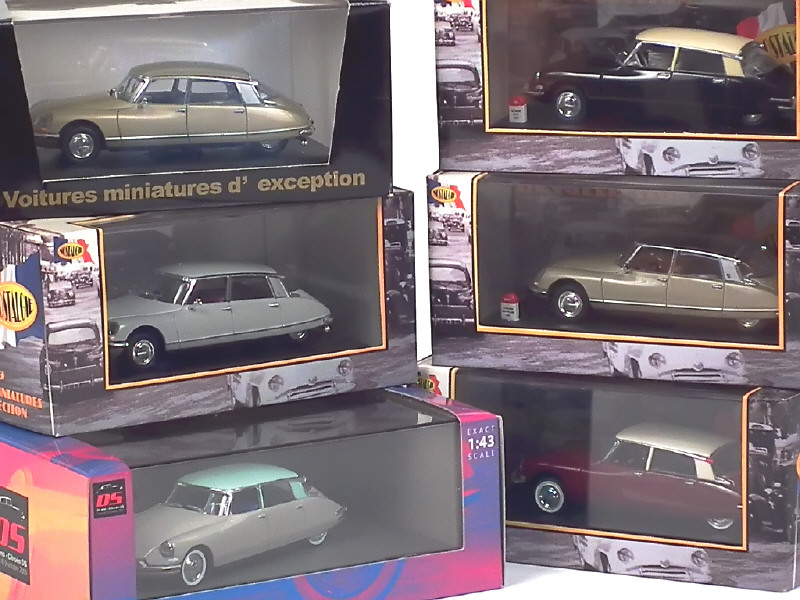 comprend : DS 19 1956 (2 exemplaires différents) & DS 21 PALLAS 1968 (2 exemplaires différents) - on y joint une DS 19 '50 ANS PARIS OCTOBRE 2005' (série limitée numérotée 82/1000 exemplaires de la marque UNIVERSAL HOBBIES) & une DS 21 PALLAS 1968 (de la marque SUN STAR MODELS)