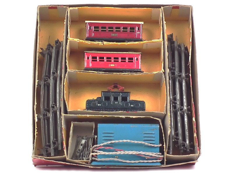 contient : une motrice 4C type boîte à sel, 12 rails courbes, 2 voitures de voyageurs de première classe (dont une repeinte) & un transformateur (non testé) - avec parties casssées & non d'origine (nombreuses transformations)