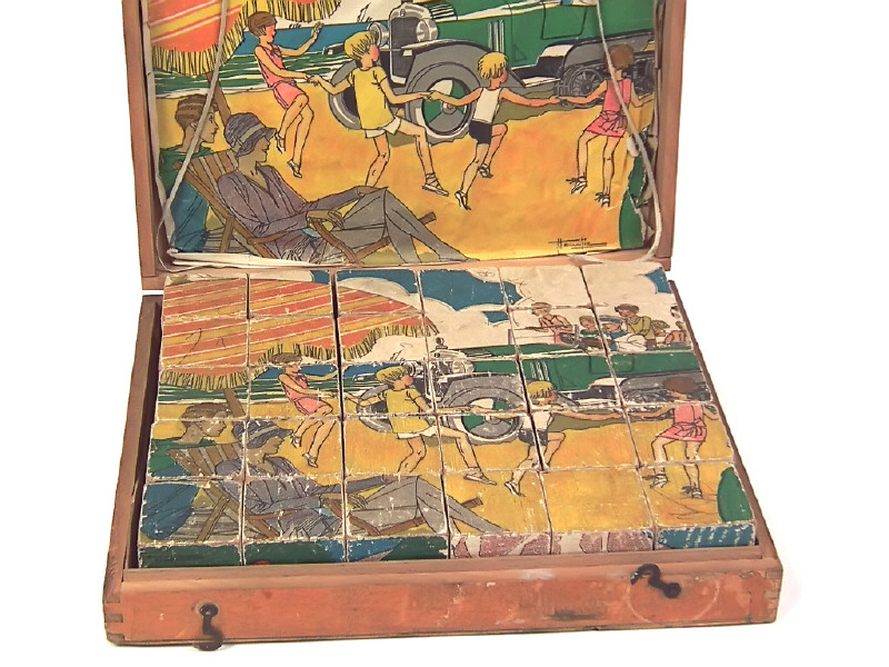 dimensions du coffret : 27,5 x 23,5 cm - contient 30 cubes avec papiers illustrés sur chaque face permettant la réalisation de différentes scènes - avec 5 affichettes illustrées (plus ou moins incomplètes) - manque illustration de coffret - annotations sur quelques cubes