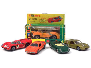 états de 'A' à 'B' - comprend : Mc LAREN M8F (en boîte état 'c'), MASERATI BORA, ASTON MARTIN (détails de peinture ajoutés), LOTUS EUROPA & FERRARI 330 P SILVERSTONE (manque pilote & décalques) - on y retrouve les marques : MERCURY, POLITOYS & MEBETOYS