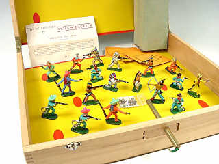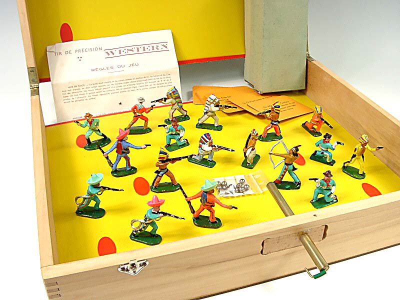 dimensions du coffret : 80 x 47 cm - avec boîte de rangement, notice, cartes, billes, 9 cow-boys & 9 indiens