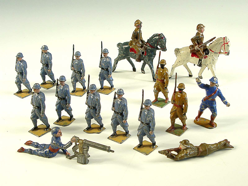comprend : 9 soldats en uniforme gris bleu au défilé, 2 tirailleurs sénégalais, un mitrailleur, un tirreur couché, un officier & 2 cavaliers avec bras articulé - manque quelques extrémités de fusils & un sabre
