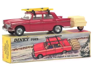 DINKY TOYS (FRANCE) 536 PEUGEOT 404 avec remorque monoroue (skis jaunes) rouge