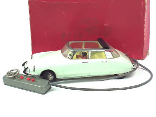 longueur 31 cm - moteur à pile, éclairage des phares, avertisseur sonore, direction & témoin lumineux de tableau de bord (fonctionnent) - avec conducteur (séché & craquelé)