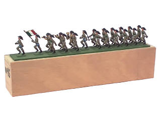 collés sur socle & présentés dans un coffret de réalisation artisanale (dimensions : 53 x 9 x 11,5 cm) - comprend : 2 officiers, porte-étendard, 6 musiciens & 12 soldats