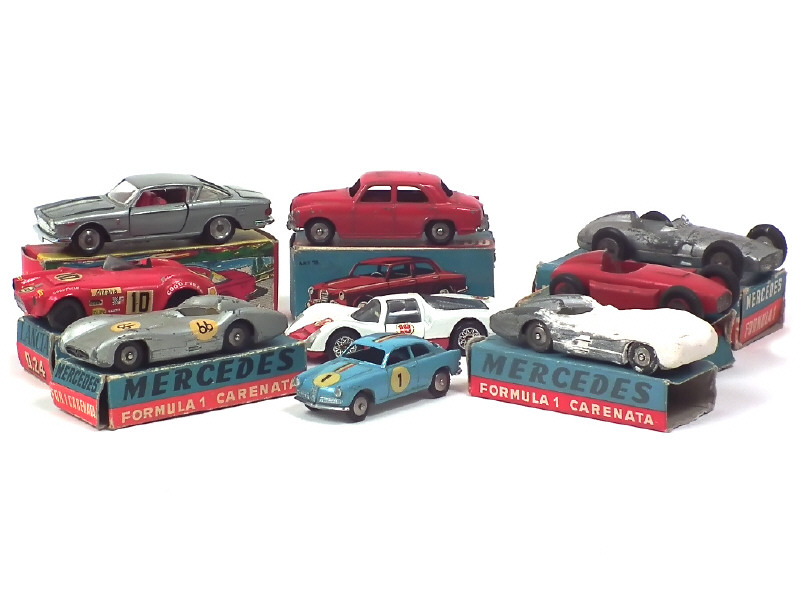états de 'C' à 'R' - comprend : FIAT 2300 S coupé (importantes traces de métal fatigue sur le capot-moteur - un décalque & petits détails de peinture ajoutés), LANCIA D24, D50, ALFA ROMEO 1900, GIULLIETTA, MERCEDES F1 (3 exemplaires dont 2 identiques) & PORSCHE CARRERA 6 - 2 boîtes en état 'c' & 5 boîtes en état 'd'