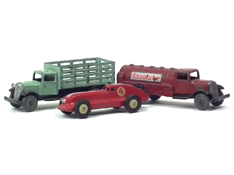 comprend : camion maraîcher (version avec roues zamac , en état 'E.o', crochet d'attelage cassé & manquant, traces de métal fatigue principalement sur les roues), camion-citerne 'ESSOLUBE ESSO' (en état 'E.o' - version avec roues zamac, manque phares, traces de métal fatigue) & HOTCHKISS de course (en état 'C.o' , pneus 'M' non conformes)