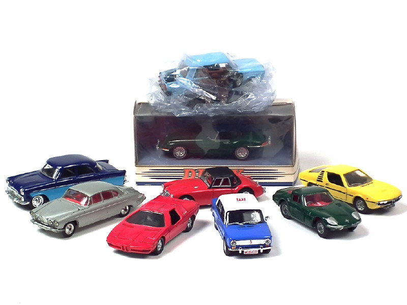 états de 'A' à 'R' - comprend : JAGUAR type E (avec boîte en état 'b'), MARK X, MARCOS VOLVO, ALFA ROMEO MONTREAL, BMW TURBO, FORD ZODIAC, MGA 1600 & LADA (2 exemplaires différents dont un en état 'F') - on y retrouve notamment les marques : DINKY MATCHBOX, CORGI TOYS & NOREV - quelques manques