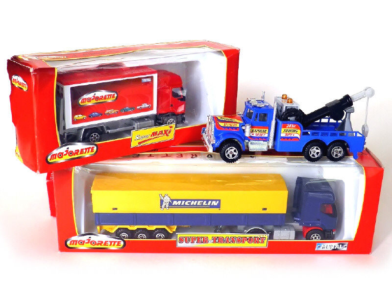 miniatures reproduisant les modèles : KENWORTH dépannage, RENAULT PREMIUM avec semi 'MICHELIN' (boîte état 'b') & RENAULT PREMIUM fourgon 'MAJORETTE'