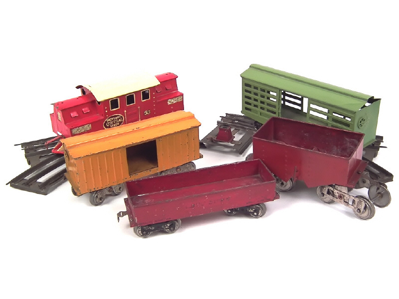 écartement 52 mm - comprend : caboose (non testé), wagon à claire-voies, bâché, trémie & tombereau - traces d'oxydation, manques & parties non d'origine - on y joint 2 aiguillages, un croisement & 9 rails courbes (traces d'oxydation)