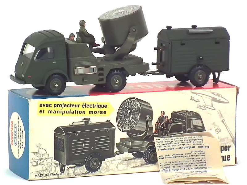 avec remorque groupe électrogène (électrique) & mécanisme de morse lumineux relié au projecteur (non testé - câblages coupés & incomplets) - avec notice (petites annotations) & 3 soldats - traces de métal fatigue plus ou moins importantes sur la cabine & le châssis (entièrement en métal fatigue) avec déformations - manque une extrémité de pare-chocs avant