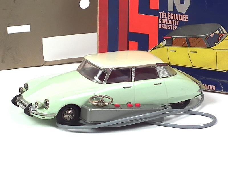 longueur 31 cm - moteur à pile, avertisseur sonore, phares électriques, témoin lumineux sur le tableau de bord & direction (à revoir) - quelques manques de peinture sur le plancher, le boîtier de commandes & le bas de la portière conducteur - petites fêlures sur le pare-brise - avec cales de fond de boîte