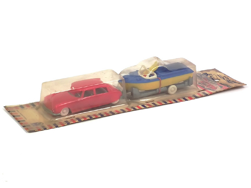 JEAN (ALLEMAGNE) CITROEN DS 19 avec hors-bord sur remorque rouge, jaune & bleu
