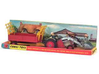 CORGI TOYS (GB) GS9 MASSEY FERGUSON 65 avec pelle chargeuse & remorque-fourragère basculante rouge & jaune
