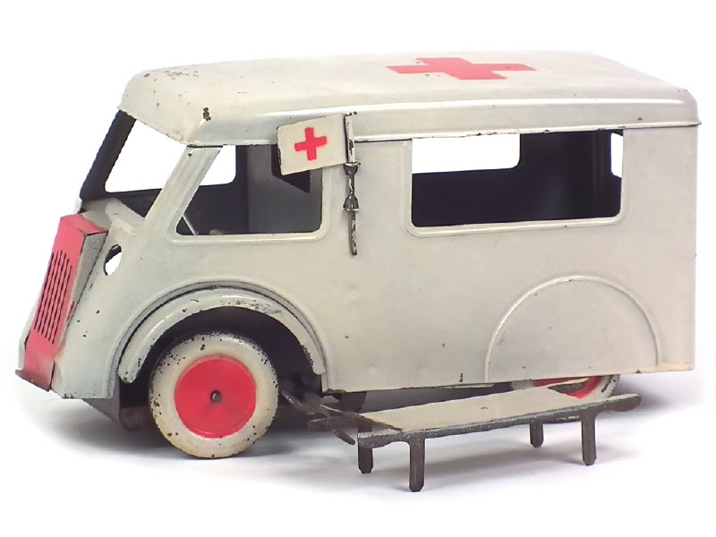 longueur 22 cm - moteur à ressort (fonctionne) - avec direction, fanion amovible & brancard - traces d'oxydation plus ou moins importantes principalement sur le châssis - manque de peinture sur la bande de roulement des roues