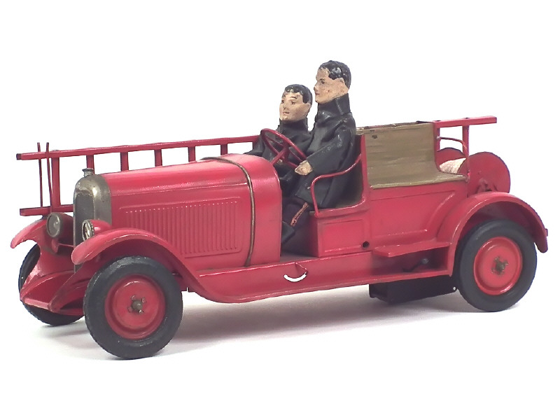longueur 39 cm - fabriquée de 1933 à 1934 - moteur à clef (à revoir) - direction par le volant - avec phares électriques (non testés), dévidoir, échelle & 2 pompiers (manque casques & un bras) - quelques légers manques, éléments non d'origine & parties plus ou moins retouchées