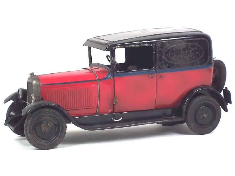 longueur 39 cm - moteur à clef (fonctionne) - cette camionnette présente des panneaux latéraux tôlés avec parties ovoïdes en relief permettant de recevoir une publicité & un hayon arrière s'ouvrant en 2 parties - roue de secours sur support amovible - la partie inférieure du hayon est totalement rapportée sur un cadre adapté et une peinture beaucoup plus vive (cette partie a certainement fait l'objet d'une restauration ultérieure) - manque poignée de portière - les phares à ampoule laissent à penser que ce modèle était destiné à être électrifié (absence de support de pile, câblages & une ampoule) - quelques légères traces d'oxydation & restaurations par endroits avec petites pièces non d'origine - ce modèle n'a été recensé qu'une seule fois & une somme d'avis éclairés laisserait à penser qu'il s'agit à l'origine d'un prototype CITRÖEN sur la base de la C6 berline verte - la présente pièce est illustrée dans le tome 3 (page 116) du superbe ouvrage de Patrick Pierron sur les jouets CITROËN - REMARQUABLE !