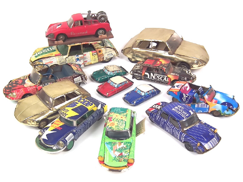 différentes échelles - réalisations en tôle de récupération - on y joint 3 modèles de la marque 'K' en états de 'B' à 'D' avec moteurs à friction (fonctionnent) - 2 exemplaires avec boîte