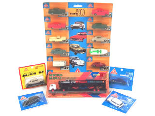 échelle 1/86ème - miniatures reproduisant les modèles : CITROEN, OPEL, BMW, CHEVROLET, DODGE, STUDEBAKER, FORD, MERCEDES & ROVER - comprend également un bateau sur remorque & une caravane - chaque emballage se détache (quelques petites parties détachées) permettant la vente des véhicules à l'unité - on y joint un PEGASO transport de voitures (avec CITROEN ID break, RENAULT 4L & SIMCA 1000) & 4 CITROEN DS - blisters jamais ouverts
