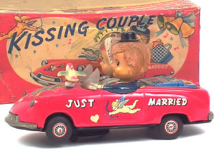 longueur 27 cm - en action, la CITROËN DS cabriolet avance en contournant les obstacles après les avoir heurtés, les 2 personnages tournent leurs têtes pour s'embrasser après quoi le conducteur rougit, l'oiseau sur le capot tourne sur lui-même & chante (moteur à piles à revoir) - quelques petites rayures par endroits - 2 pneus coupés