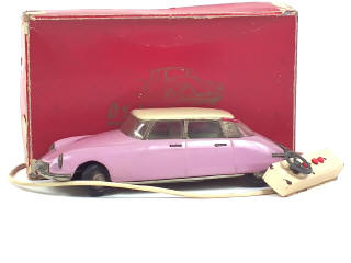 longueur 31 cm - moteur à pile, avertisseur sonore & direction (fonctionnent) - phares électriques (à revoir) - version sans témoin lumineux sur le tableau de bord - avec cale de boîte - un montant de toit non d'origine - quelques petites rayures sur le toit - manques de pellicule dorée plus ou moins importants - une agrafe de châssis incomplète