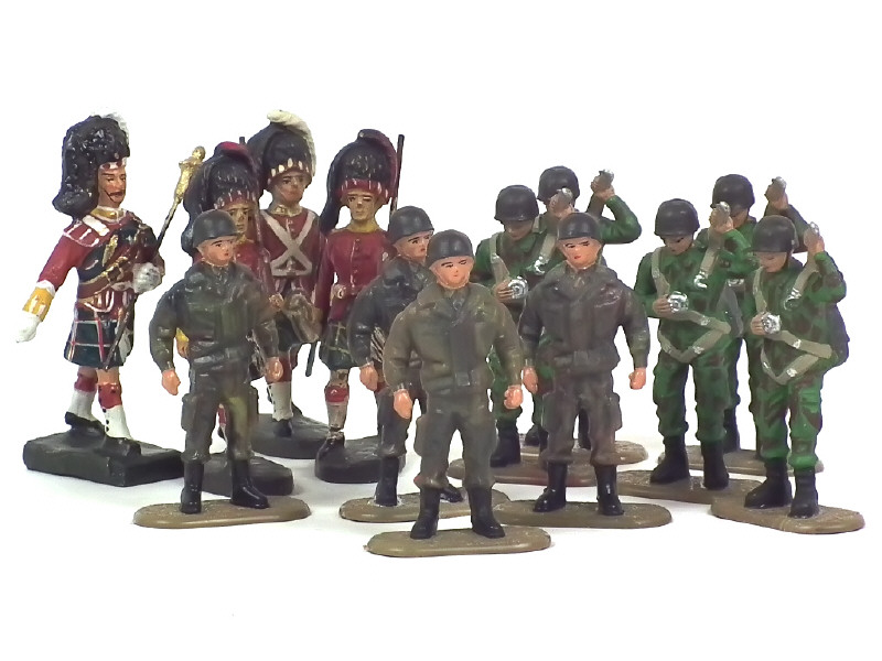 comprend : 9 parachutistes & 4 écossais (réalisation en composition, petites craquelures, état 'B') - on y retrouve les marques : LEYLA (réalisation en plastique) & DURSO