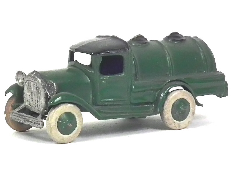 production en plomb de 1930 - grille de calandre, phares & pare-chocs rapportés - version avec pneus caoutchouc (séchés & tachés) - mention 'PETROL' gravée en relief sur l'arrière de la citerne - éclats majeurs sur l'arrière du modèle - manques de peinture sur une jante