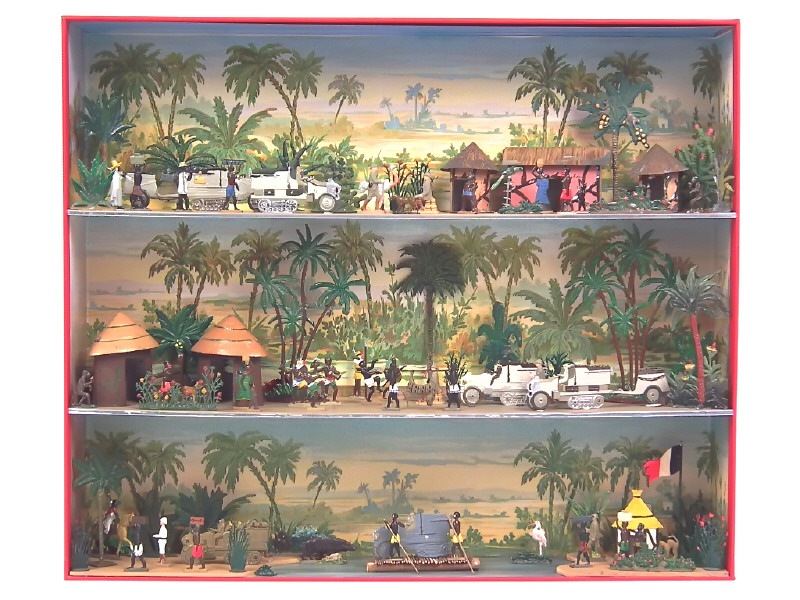 dimensions : 53,5 x 45 x 9,5 cm - contient : personnages, animaux, 6 autochenilles (plats d'étain) & éléments de décor (production originale & récente) - sur socles de présentation - quelques éléments en état 'C', avec éclats majeurs & d'autres retouchés - manque couvercle de boîte (fabrication récente) - très légers manques - BEL ENSEMBLE !