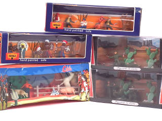 comprend : 2 exemplaires militaires (7 figurines décollées du socle), cow-boys, indiens & de la ferme - on y retrouve notamment les marques : COFALU & HERALD - quelques petites déchirures sur les boîtes par endroits