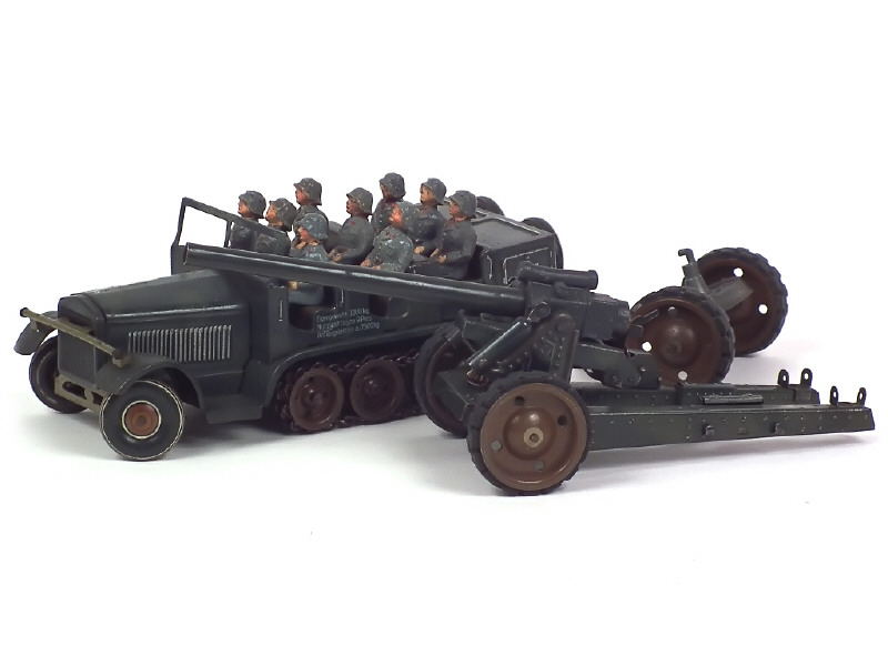 longueur de l'ensemble : 39 cm - moteur à clef (fonctionne) & direction - avec 9 soldats (6 en état 'B' & 3 en état 'C') - quelques traces d'oxydation - petits manques de peinture sur les banquettes