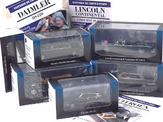 collection voitures de chefs d'états réalisée par NOREV - comprend : CADILLAC V16 QUEEN MARY, ELDORADO PARADE, LINCOLN CONTINENTAL limousine, MERCEDES 300 LANDOLETTE, DAIMLER 420 limousine, CITROEN DS 21 CHAPRON & DS 23 - 7 fascicules correspondants