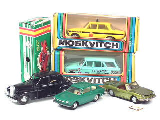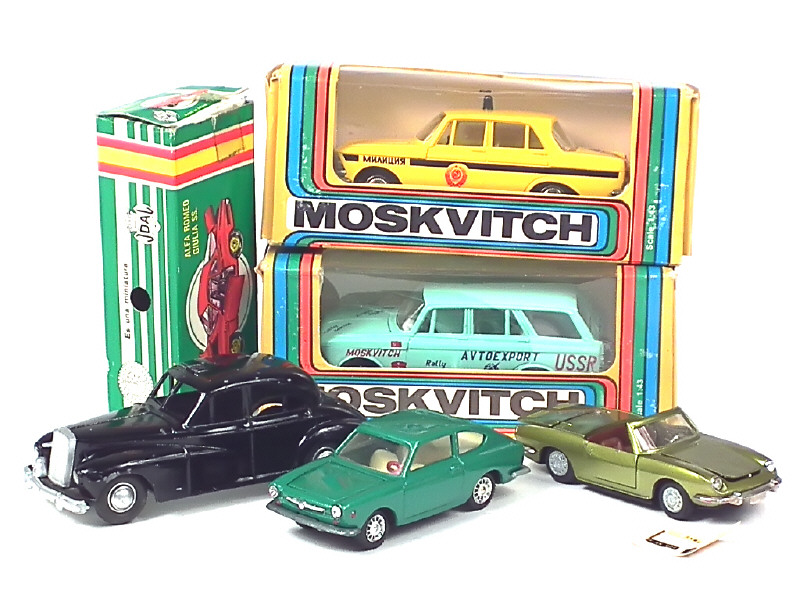 comprend : MOSKVITCH (2 exemplaires différents de fabrication soviétique), SEAT 850 coupé, 850 SPYDER (fixations de capot de malle cassées) & WOLSELEY SIX-EIGHTY (en état 'C' avec éléments manquants) - on y retrouve les marques : JOAL, BUDGY & PILEN (traces de métal fatigue) - on y joint une boîte vide ALFA ROMEO GIULIA SS (en état 'c')